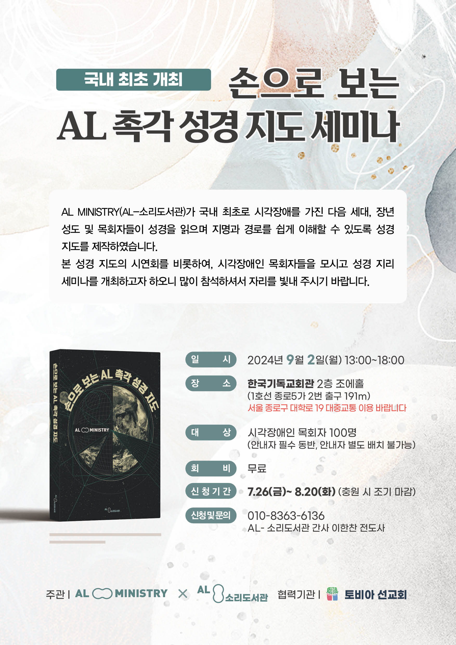 AL MINISTRY(AL-소리도서관)가 국내 최초로 시각장애를 가진 다음 세대, 장년 성도 및 목회자들이 성경을 읽으며 지명과 경로를 쉽게 이해할 수 있도록 성경 지도를 제작하였습니다. 본 성경 지도의 시연회를 비롯하여, 시각장애인 목회자들을 모시고 성경 지리 세미나를 개최하고자 하오니 많이 참석하셔서 자리를 빛내 주시기 바랍니다.
