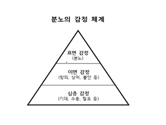 인간의 감정 체계는 위의 표에서 보는 것처럼, 겉으로 표출되는 감정은 진짜 감정이 아니라 가짜 감정이고, 진짜 감정은 이면 감정과 심층 감정에 숨겨져 있다. 외상 고통 가운데 있는 사람이 표출하는 분노의 이면 감정은 항의, 상처, 불안이고, 심층 감정은 삶의 증언과 치유를 소망하는 감정이 함께 연결되어 있다고 할 수 있다. 교회 공동체는 심한 상실과 외상 고통 가운데 있는 사람이 표출한 분노의 이면 감정과 심층 감정을 이해할 때 깊은 경청을 할 수 있다.