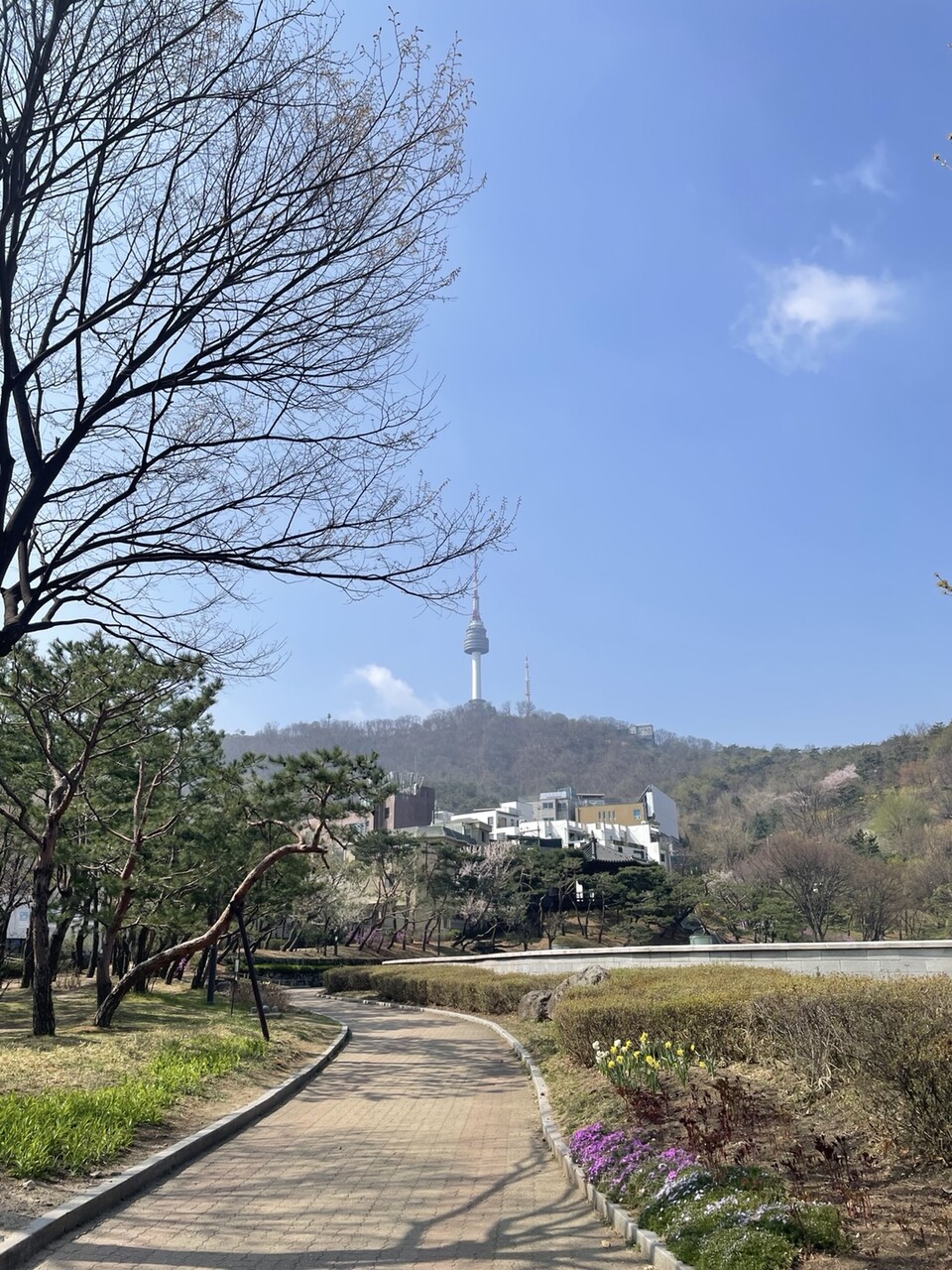 이 사진은 야외 공원에서 남산서울타워를 배경으로 촬영된 풍경 사진입니다.