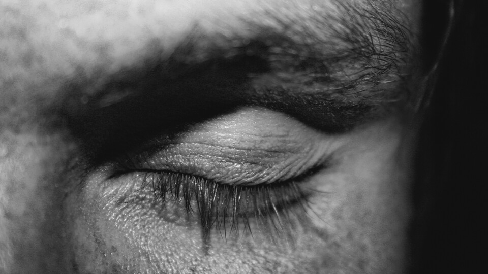 이 사진은 흑백으로 처리된 사람의 눈을 클로즈업한 이미지입니다. 눈은 감긴 상태이며, 속눈썹과 눈꺼풀의 질감, 피부의 주름과 모공이 선명하게 보입니다.